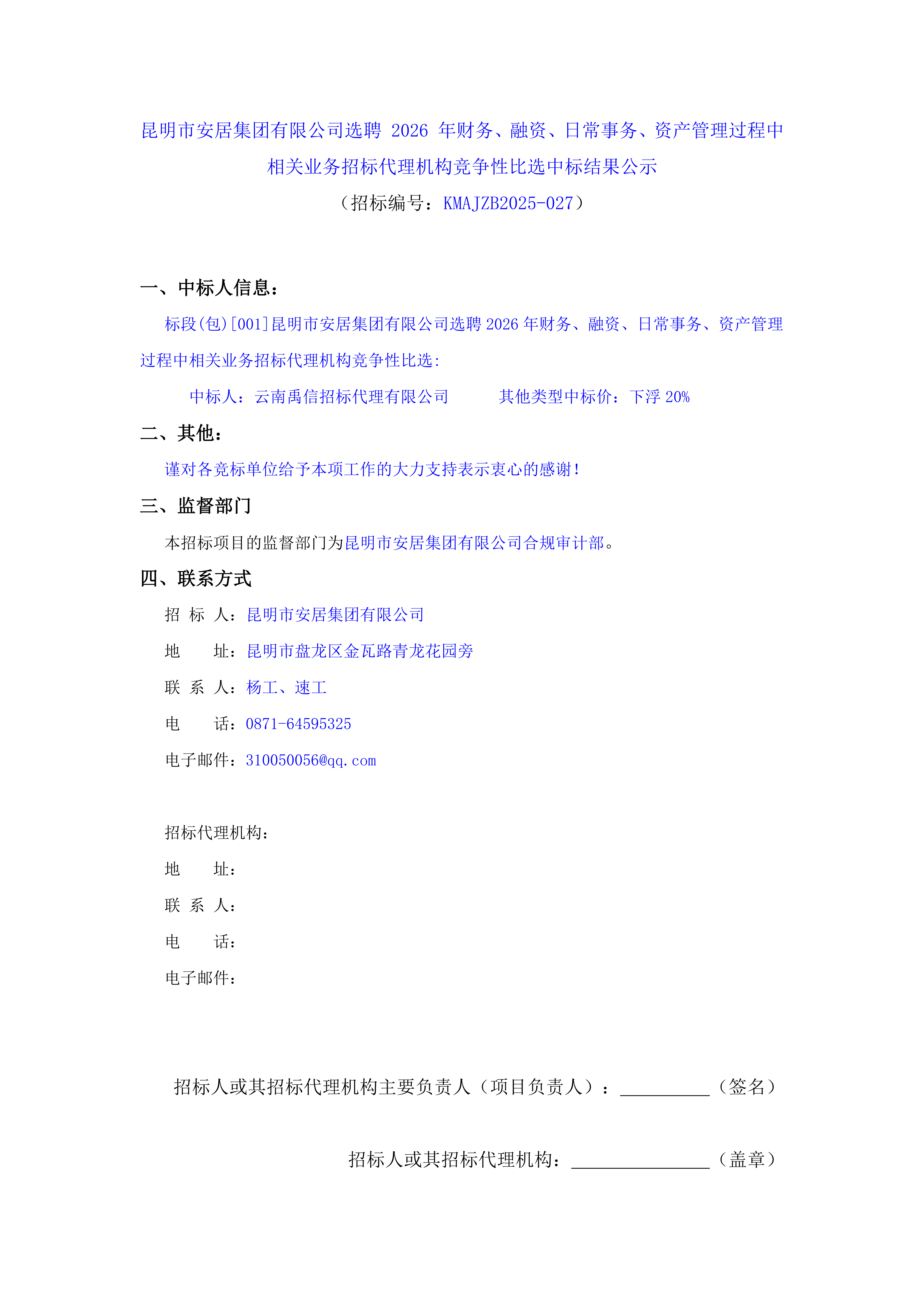 昆明市安居集团有限公司选聘 2026 年财务、融资、日常事务、资产管理过程中相关业务招标代理机构竞争性比选中标结果公示