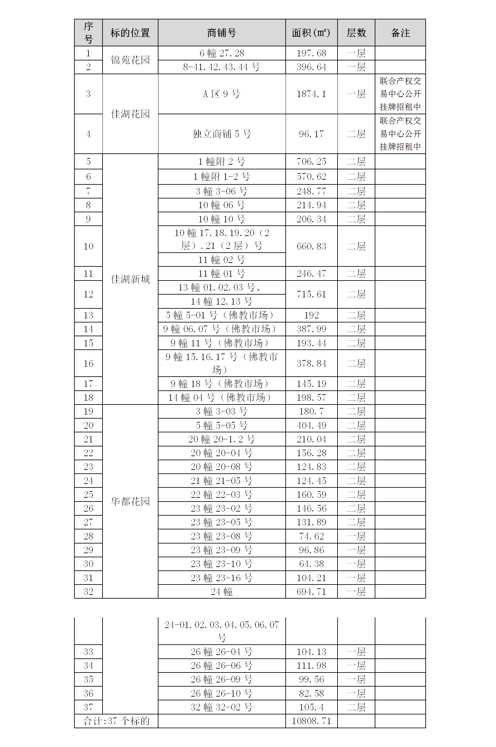底层商铺需要招租:37个标的,面积为10808.71平方米。