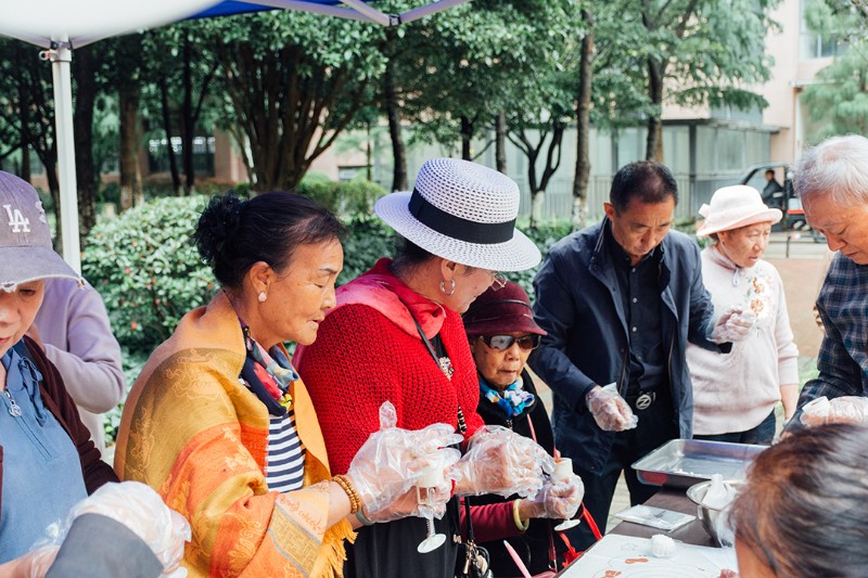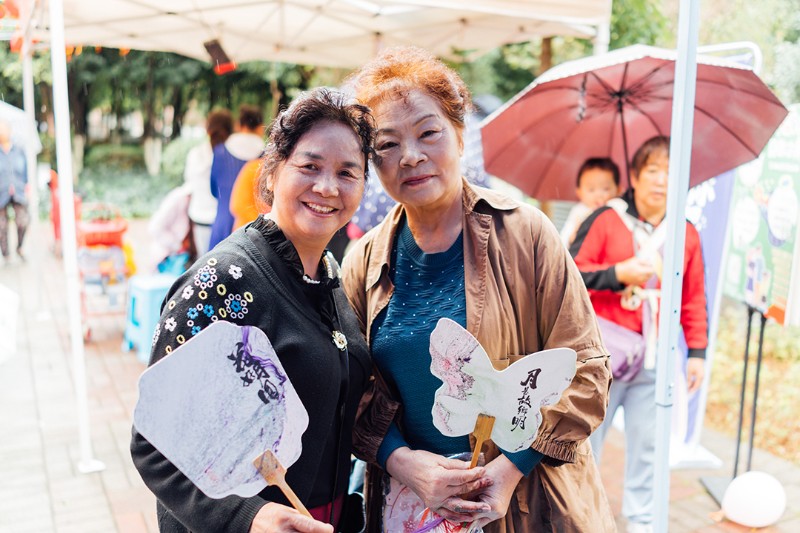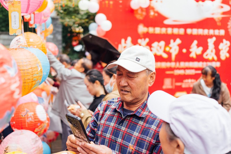 9月30日上午,泽惠园小区1栋前广场设置了漆扇体验区、月饼制作区和猜灯谜专区,现场人头攒动,欢声笑语不绝于耳。漆扇制作区,大朋友小朋友们手持素白的团扇,小心翼翼地将颜料滴入水中,看着色彩在水中自由舒展、交融变幻,再以巧思将扇面轻轻点入、提拉。顷刻间,一幅幅独一无二、流光溢彩的图案便定格在扇面上。“太神奇了!就像把中秋的月色和云霞都收进了这把扇子里,这是市面上买不到的艺术品,更是我们全家独特的节日记忆。”泽惠园小区住户李女士一边展示手里的团扇,一边欣喜地说。